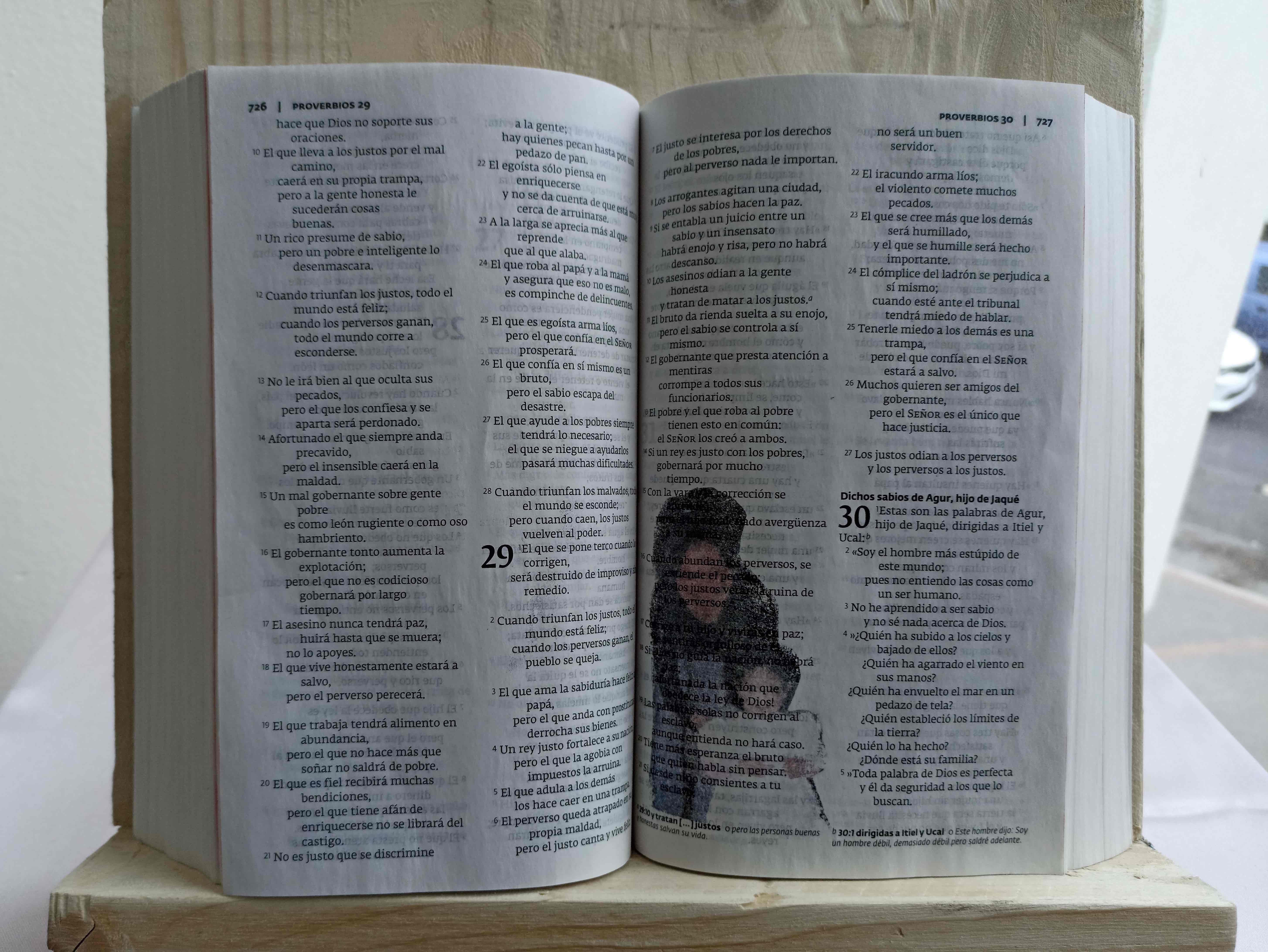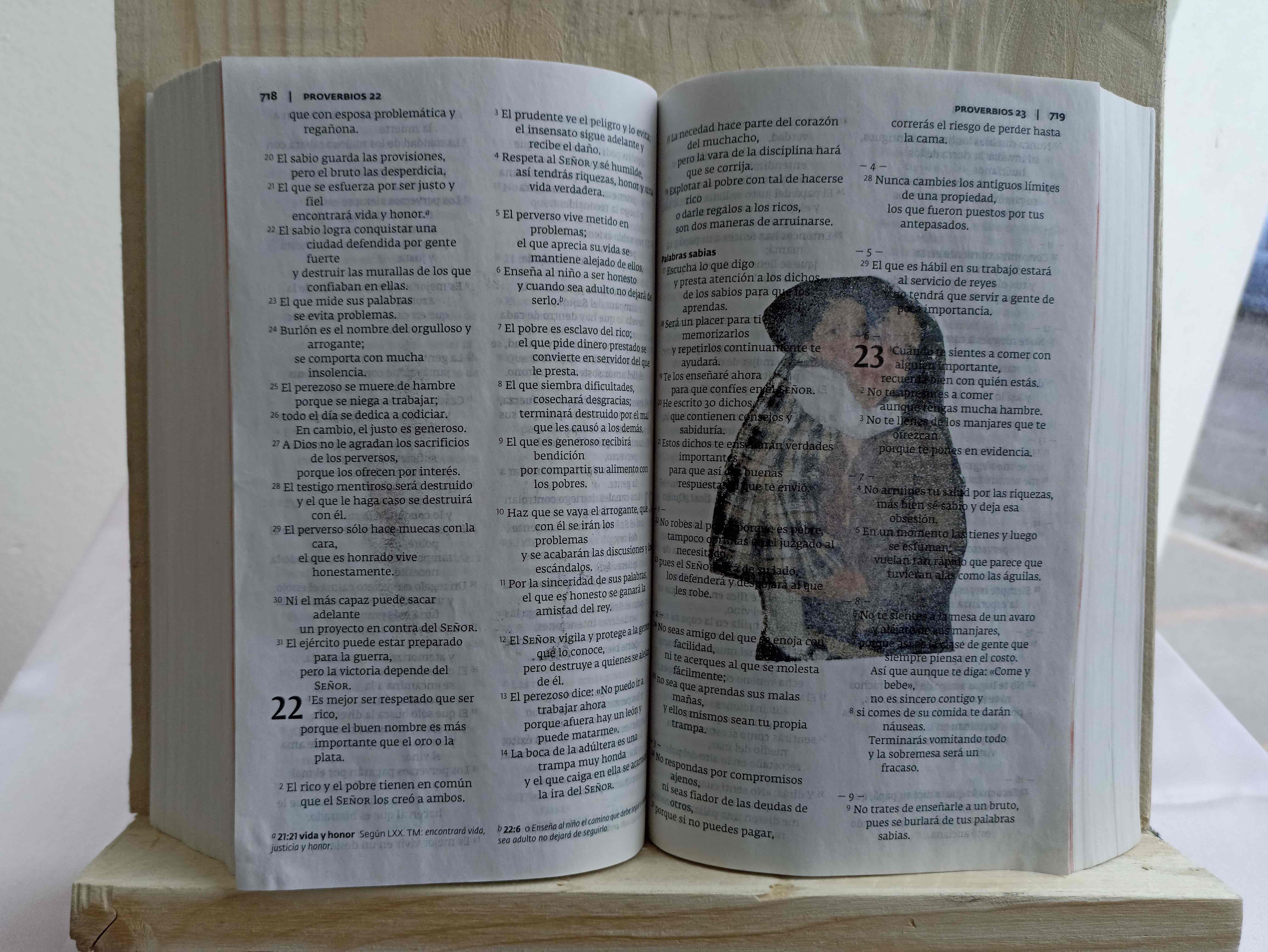 Biblia intervenida con transfer de fotografías del archivo familiares de la artista