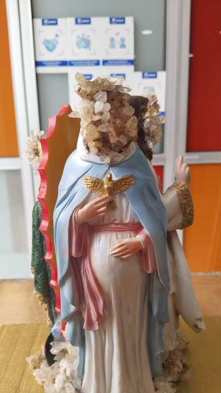 Figuras religiosas hechas de resina modificadas con cuarzos cristales y figuras de plastilina secado al aire libre en una base de madera.